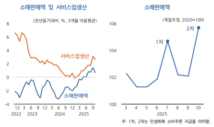소비도 반등 흐름을 뒷받침하고 있다. 소매판매는 9월(2.2%)에 이어 10월(0.3%)까지 플러스를 이어갔고, 소비자심리지수도 기준치(100)를 웃도는 112.4를 기록했다. 특히 '민생회복 소비쿠폰' 지급과 지역화폐 할인 등의 소비 진작 정책을 통해 의복·식료품이 크게 증가했다. 예술·스포츠·여가 등 생활형 서비스 소비 역시 증가 흐름을 보였다.