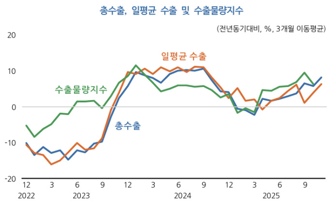 이에 대해 KDI는 "반도체 수출의 높은 증가세는 가격 급등에 일부 기인한 것으로 보이며, 물량 기준으로는 높았던 증가세가 점차 조정되는 모습이 나타났다"며 "한미 관세 후속 협상이 체결됐으나 미 연방대법원의 상호관세 적법성 판결이 남아있는 등 통상환경의 불확실성은 지속되는 모습"이라고 설명했다.