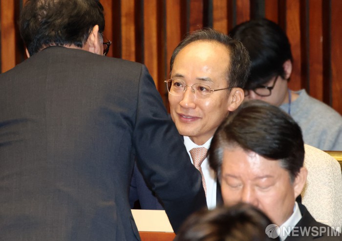 [서울=뉴스핌] 최지환 기자 = 추경호 국민의힘 의원이 8일 오전 서울 여의도 국회에서 열린 국민의힘 의원총회 및 이재명 정권 독재악법 국민고발회에서 소속 의원들과 대화를 나누고 있다. 2025.12.08 choipix16@newspim.com