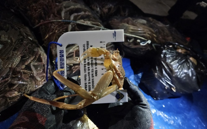 포항해경은 잠복 근무에 들어가 같은 날 오후 7시 11분쯤 입항한 B호에 대한 수색 과정에서 우현 선수 갑판 그물 밑에 은닉된 체장 9cm 이하의 체장 미달 대게 647마리를 적발했다.