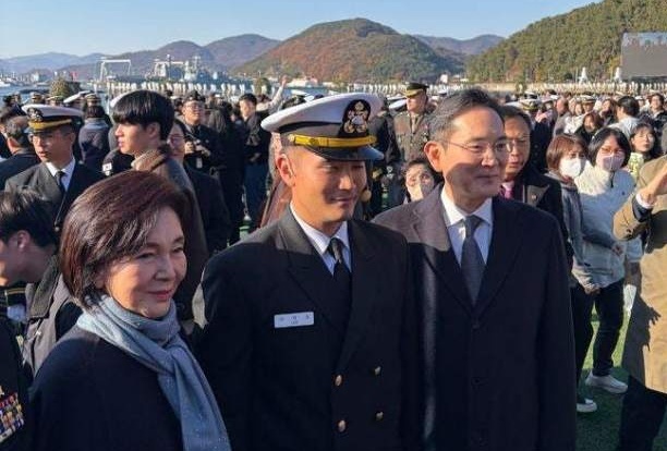 | 이재용 삼성전자 회장이 28일 오후 경남 창원시 진해구 해군사관학교에서 열린 제139기 해군 사관후보생 임관식에 참석해 장남 지호씨의 소위 임관을 축하했다. 이 회장과 홍라희 삼성미술관 리움 명예관장이 지호씨와 함께 사진 촬영하고 있다. 공동취재단 2025.11.28 gomsi@newspim.com |