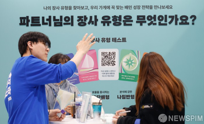 [서울=뉴스핌] 류기찬 기자 = 8일 오후 서울 서초구 aT센터에서 열린 ‘2025 배민파트너페스타’를 찾은 관람객들이 장사 유형 테스트를 하고 있다. 2025.12.08 ryuchan0925@newspim.com