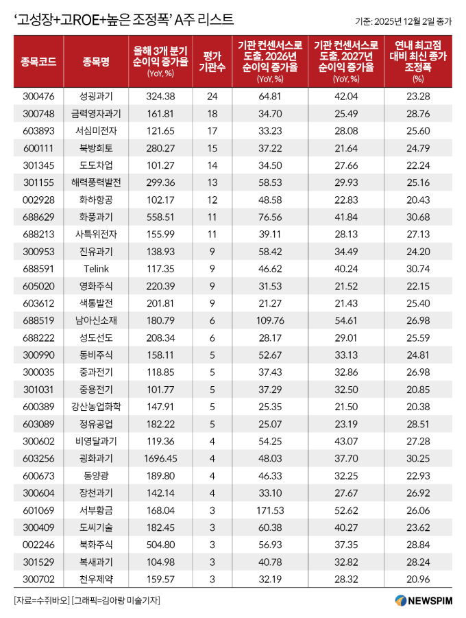 중국 관영 증권시보(證券時報) 산하의 데이터 산출 플랫폼 수쥐바오(數據寶)에 따르면 세 곳 이상 기관의 평가가 있었으며, 3분기 순이익이 전년 동기 대비 배(100%) 이상 증가하고, 비경상 항목을 제외한 평균 자기자본이익률(ROE)이 5%를 초과한 A주 종목 중에서 30개주는 향후 1~2년 순이익 성장률이 20%를 넘어설 것으로 예상된다. 이들 30개주의 최신 주가는 연내 최고점 대비 20% 이상 빠진 상태다.