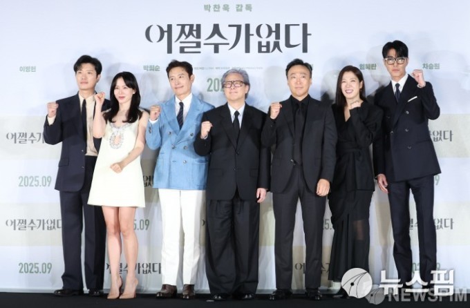 | [서울=뉴스핌] 김학선 기자 = 박찬욱 감독을 비롯해 출연배우들이 19일 서울 용산구 CGV 용산아이파크몰에서 열린 영화 '어쩔수가없다' 제작보고회에서 포즈를 취하고 있다. 왼쪽부터 배우 박희순, 손예진, 이병헌, 박찬욱 감독, 배우 이성민, 염혜란, 차승원. '어쩔수가없다'는 모든 것이 만족스러웠던 회사원 만수가 갑작스러운 해고 이후 가족과 집을 지키기 위해 재취업 전쟁에 뛰어드는 이야기를 그린다. 2025.08.19 yooksa@newspim.com |