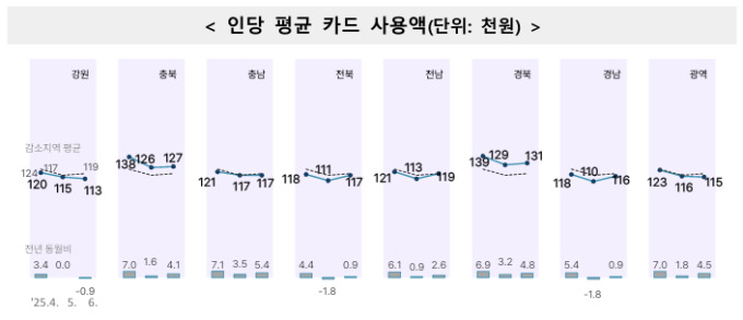인구감소지역의 인당 평균 카드 사용액은 '충북'(6월 12만7000원)과 '경북'(13만1000원)이 전체 평균보다 많았다. 같은 달 기준으로 가장 적은 곳은 '강원'(11만3000원)과 '광역'(11만5000원)이었다.
