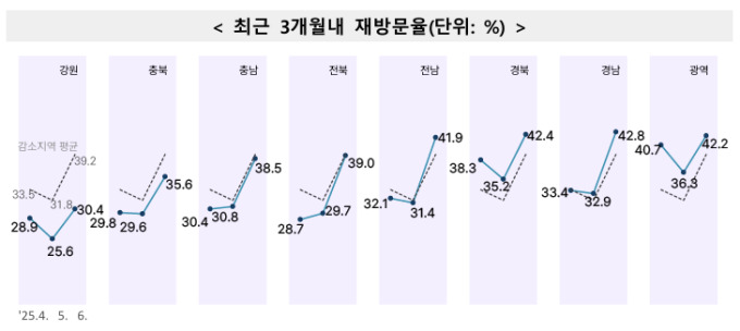 최근 3개월 내 재방문율은 '경북'(6월 42.4%)과 '광역'(42.2%)이 가장 높았다. 반면 같은 달 '강원'은 30.4%로 가장 저조한 수준을 기록했다.