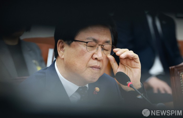 [서울=뉴스핌] 정일구 기자 = 최교진 교육부 장관이 9일 오전 서울 여의도 국회에서 열린 교육위원회 전체회의에서 안경을 고쳐쓰고 있다. 2025.12.09 mironj19@newspim.com