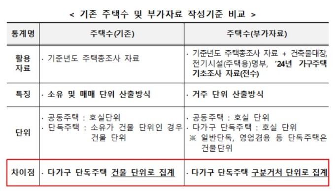 기존 주택 수는 다가구 단독주택을 건물 단위로 파악했으나, 부가자료는 이를 구분거처 단위로 셌다는 설명이다. 부가자료 조사에서도 일반단독 및 영엽겸용 단독주택은 건물 단위로 확인했다.