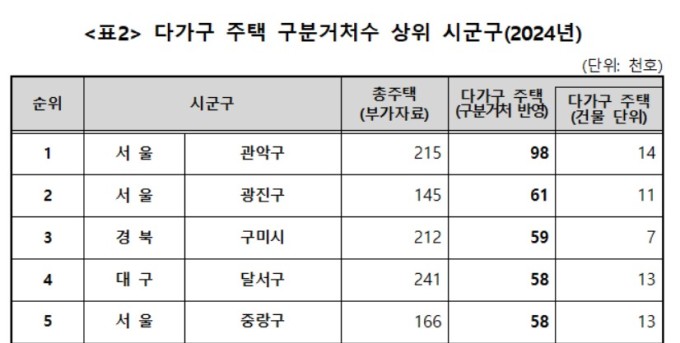 시군구별로는 서울 관악구, 서울 광진구, 경북 구미시, 대구 달서구, 서울 중랑구 순으로 다가구주택 구분거처수가 많았다.