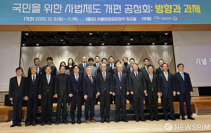 [서울=뉴스핌] 양윤모 기자 = 천대엽 법원행정처장이 9일 서울 서초구 서울법원종합청사 청심홀에서 열린 '국민을 위한 사법제도 개편' 공청회에서 참석자들과 기념촬영을 하고 있다.최근 국회에서 사법개혁 논의가 활발하게 진행되고 있는 가운데, 사법부가 공론의 장을 마련해 주권자인 국민의 입장에서 필요하고 바람직한 사법제도 개편 방향에 대해 법조계, 학계, 언론계 및 시민사회단체 등 다양한 분야 전문가들의 의견을 청취하고자 11일까지 진행한다. 2025.12.09 yym58@newspim.com