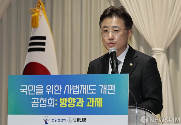 [서울=뉴스핌] 양윤모 기자 = 이진수 법무부차관이 9일 서울 서초구 서울법원종합청사 청심홀에서 열린 '국민을 위한 사법제도 개편' 공청회에 참석해 축사를 하고 있다.최근 국회에서 사법개혁 논의가 활발하게 진행되고 있는 가운데, 사법부가 공론의 장을 마련해 주권자인 국민의 입장에서 필요하고 바람직한 사법제도 개편 방향에 대해 법조계, 학계, 언론계 및 시민사회단체 등 다양한 분야 전문가들의 의견을 청취하고자 11일까지 진행한다. 2025.12.09 yym58@newspim.com