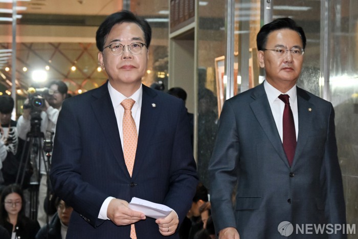 [서울=뉴스핌] 정일구 기자 = 송언석 국민의힘 원내대표가 9일 오전 서울 여의도 국회에서 우원식 국회의장, 김병기 더불어민주당 원내대표와 회동을 갖기 위해 의장실로 향하고 있다. 2025.12.09 mironj19@newspim.com