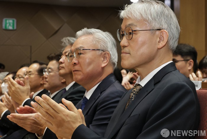 [서울=뉴스핌] 양윤모 기자 = 천대엽 법원행정처장이 9일 서울 서초구 서울법원종합청사 청심홀에서 열린 '국민을 위한 사법제도 개편' 공청회에 참석해 이진수 법무부차관 축사에 박수를 보내고 있다. 최근 국회에서 사법개혁 논의가 활발하게 진행되고 있는 가운데, 사법부가 공론의 장을 마련해 주권자인 국민의 입장에서 필요하고 바람직한 사법제도 개편 방향에 대해 법조계, 학계, 언론계 및 시민사회단체 등 다양한 분야 전문가들의 의견을 청취하고자 11일까지 진행한다. 2025.12.09 yym58@newspim.com