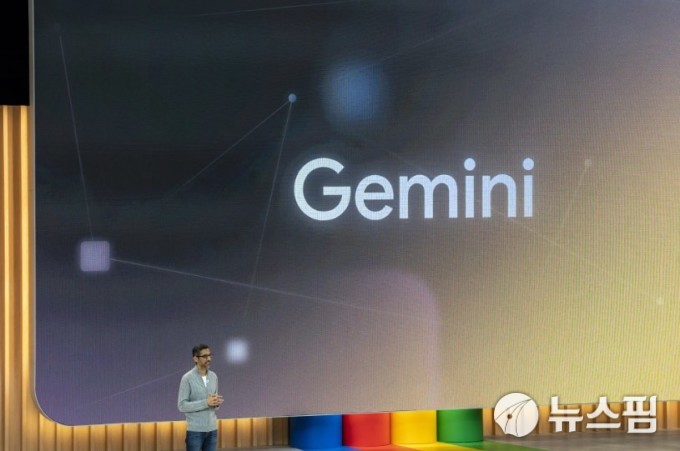 | 구글 행사 무대에서 제미나이 AI 모델을 설명하는 알파벳의 순다르 피차이 최고경영자(CEO) [사진=블룸버그통신] |