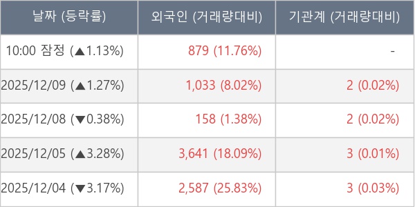 [서울=뉴스핌] 로보뉴스 = 10일 10시 15분 현재 이지트로닉스(377330)는 전일 대비 1.13% (현재가 4,020원) 상승했고, 외국인이 최근 9일 연속 순매수(누적 17,322주, 잠정) 행진을 하고 있다.