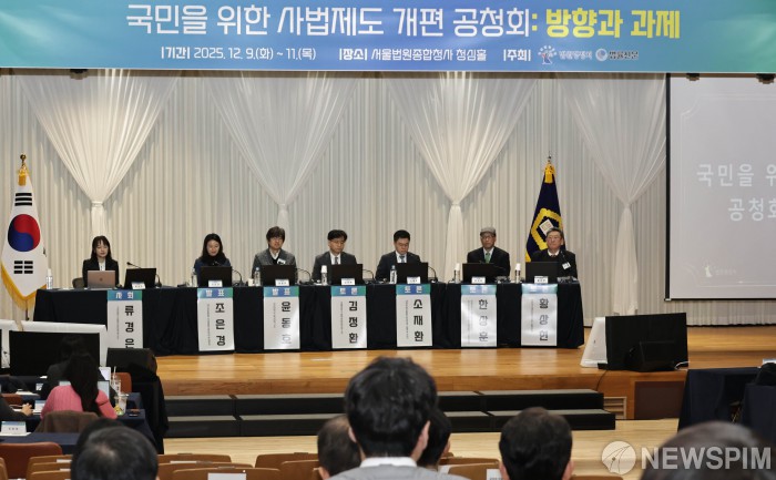 [서울=뉴스핌] 양윤모 기자 = 최근 국회에서 사법개혁 논의가 활발하게 진행되고 있는 가운데, 대법원 법원행정처가 10일 서울 서초구 서울법원종합청사 청심홀에서 '국민을 위한 사법제도 개편 공청회' 2일차를 개최했다. 토론회는 류경은 고려대학교 법학전문대학원 교수의 사회로 조은경 대구지방법원 김천지원 부장판사, 윤동호 국민대학교 법과대학 교수, 김정환 영세대학교 법학전문대학원 교수, 소재환 대전지방검찰청 부장검사, 한상훈 연세대학교 법학전문대학원 교수, 황상현 변호사가 토론에 참여했다. 2025.12.10 yym58@newspim.com
