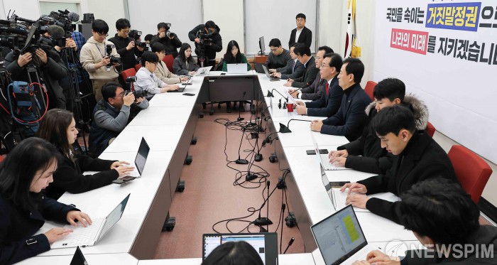 [서울=뉴스핌] 윤창빈 기자 = 송언석 국민의힘 원내대표가 10일 오전 서울 여의도 국회에서 현안 관련 기자간담회를 하고 있다. 2025.12.10 pangbin@newspim.com