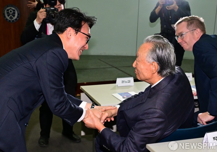 [서울=뉴스핌] 김학선 기자 = 김민석 국무총리가 10일 서울 마포구 연세대학교 김대중도서관에서 열린 김대중대통령 노벨평화상 수상 25주년 기념식에서 권노갑 김대중재단 이사장과 악수하고 있다. 2025.12.10 yooksa@newspim.com