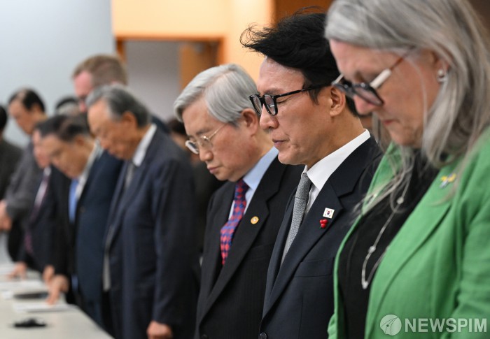 [서울=뉴스핌] 김학선 기자 = 김민석 국무총리(오른쪽 두 번째)가 10일 오후 서울 마포구 연세대학교 김대중도서관에서 열린 김대중 대통령 노벨평화상 25주년 기념식에 참석해 김대중 대통령을 추모하며 묵념하고 있다. 2025.12.10 yooksa@newspim.com