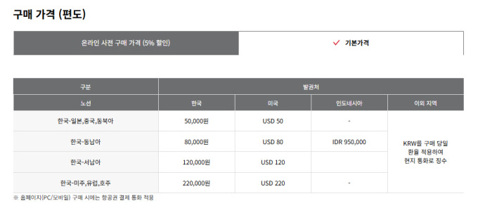 이코노미 스마티움 가격표. [사진=아시아나항공]