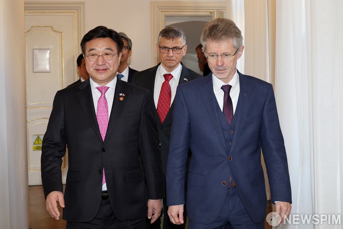 [서울=뉴스핌] 윤호중 행정안전부 장관이 10일(현지시간) 체코 상원의사당을 방문해 밀노쉬 비스트르칠 체코 상원 의장과 면담장으로 이동하고 있다. [사진=행정안전부] 2025.12.11 photo@newspim.com