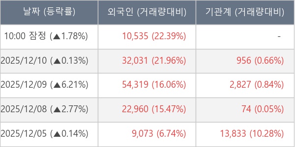 [서울=뉴스핌] 로보뉴스 = 11일 10시 15분 현재 파이버프로(368770)는 전일 대비 1.78% (현재가 8,020원) 상승했고, 외국인이 최근 5일 연속 순매수(누적 12.89만 주, 잠정) 행진을 하고 있다.