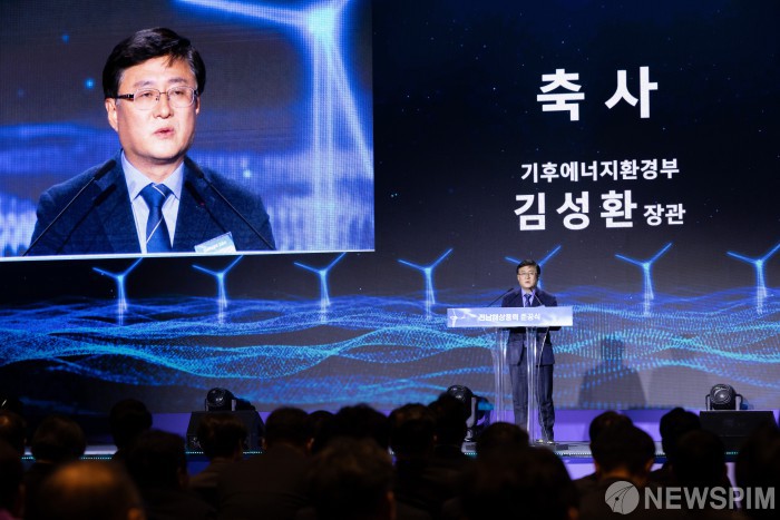 [서울=뉴스핌] 김성환 기후에너지환경부 장관이 11일 전남 신안군 라마다프라자 호텔에서 열린 전남 해상풍력 1단지 준공식에서 축사를 하고 있다. [사진=기후에너지환경부] 2025.12.11 photo@newspim.com