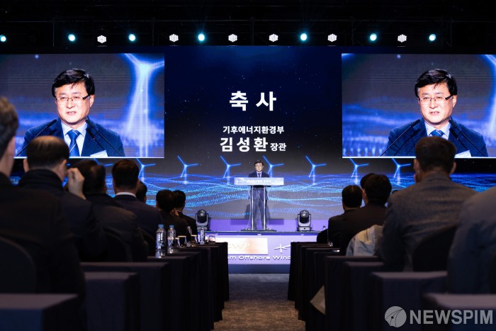 [서울=뉴스핌] 김성환 기후에너지환경부 장관이 11일 전남 신안군 라마다프라자 호텔에서 열린 전남 해상풍력 1단지 준공식에서 축사를 하고 있다. [사진=기후에너지환경부] 2025.12.11 photo@newspim.com