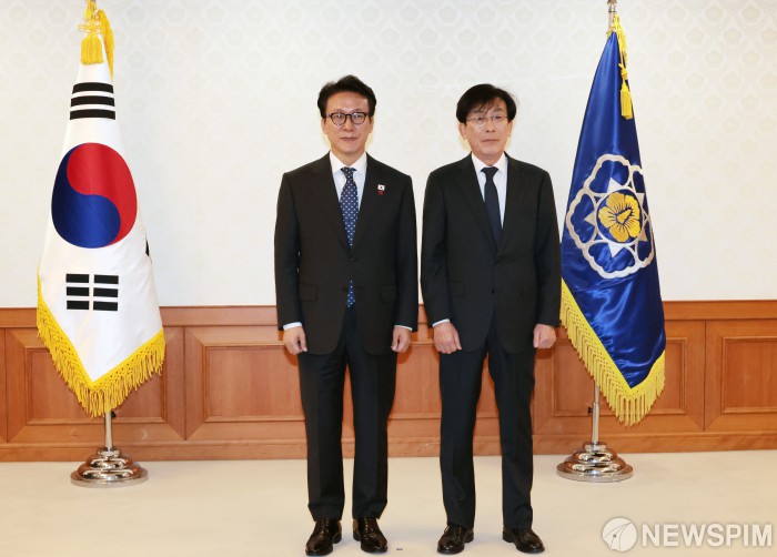 [서울=뉴스핌] 이길동 기자 = 김민석 국무총리가 11일 서울 종로구 정부서울청사에서 열린 의료혁신위원회 민간위원 위촉장 수여식에서 정기현 위원장에게 위촉장후 기념촬영을 하고 있다. 2025.12.11 gdlee@newspim.com