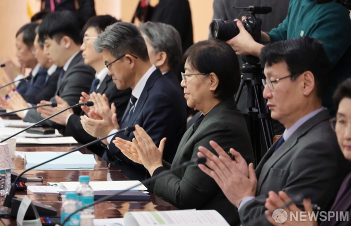 [서울=뉴스핌] 이길동 기자 = 정은경 보건복지부 장관이 11일 서울 종로구 정부서울청사에서 열린 제1차 의료혁신위원회에 참석해 박수를 치고 있다.2025.12.11 gdlee@newspim.com