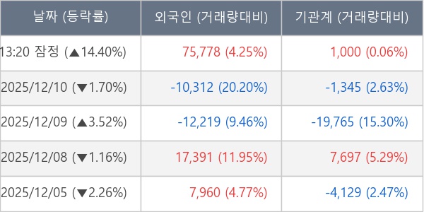 [장중수급포착] 세이브존I&C, 외국인/기관 동시 순매수… 주가 +14.40%