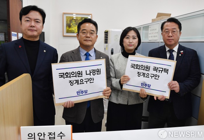 [서울=뉴스핌] 정일구 기자 = 더불어민주당 김현정(왼쪽부터), 민병덕, 백승아, 문금주 의원이 11일 오후 서울 여의도 국회 의안과에 '국민의힘 나경원, 곽규택 의원 징계 요구안'을 제출하고 있다. 2025.12.11 mironj19@newspim.com
