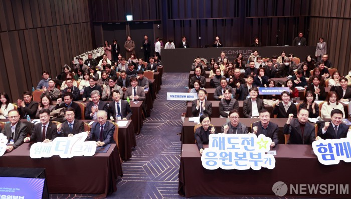 [서울=뉴스핌] 한성숙 중소벤처기업부 장관이 11일 서울 강남구 코엑스에서 열린 재도전 응원본부 발대식에서 참석자들과 기념촬영을 하고 있다. [사진=중소벤처기업부] 2025.12.11 photo@newspim.com