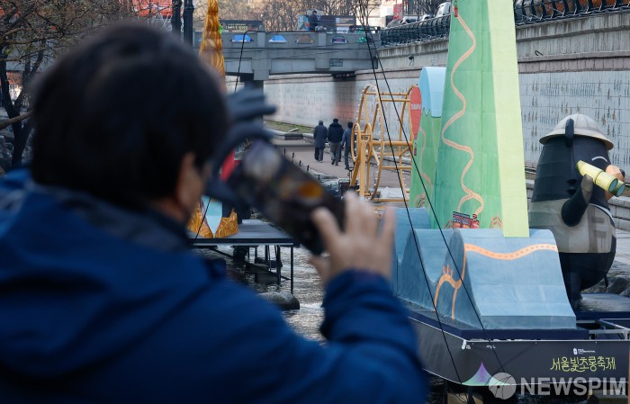 [서울=뉴스핌] 류기찬 기자 = 서울빛초롱축제 개막을 하루 앞둔 11일 오후 서울 중구 청계천 일대에서 한 시민이 조형물을 찍고 있다. 2025.12.11 ryuchan0925@newspim.com