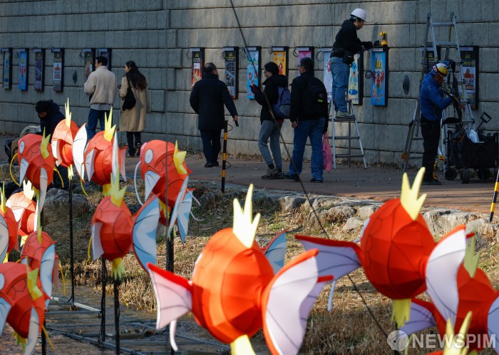 [서울=뉴스핌] 류기찬 기자 = 서울빛초롱축제 개막을 하루 앞둔 11일 오후 서울 중구 청계천 일대에서 관계자들이 조형물 설치 작업을 진행하고 있다. 2025.12.11 ryuchan0925@newspim.com