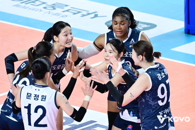 | [서울=뉴스핌] 장환수 스포츠전문기자= 한국도로공사 선수들이 11일 흥국생명과 김천 경기에서 득점에 성공한 뒤 하이 파이브를 하고 있다. [사진=KOVO] 2025.12.11 zangpabo@newspim.com |
