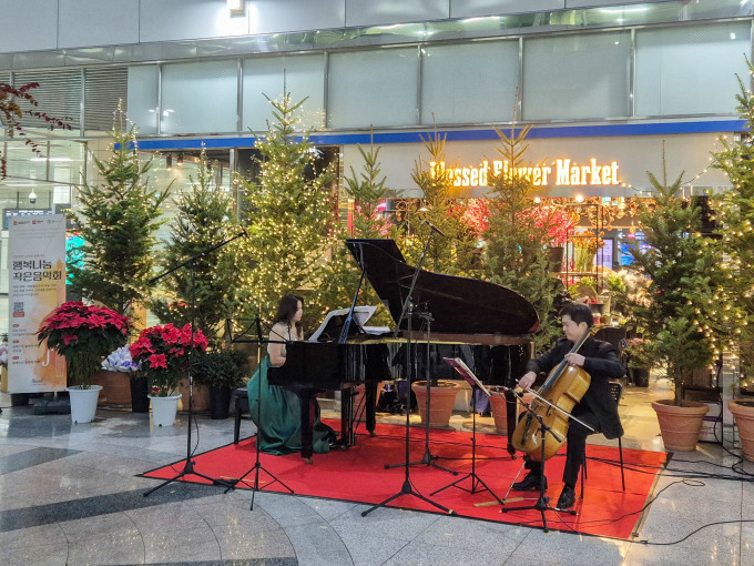 방한키트 전달 행사에 앞서 지난 5일 오후 5시, 판교역 썬큰광장에서 판교역 이용객을 대상으로 한 '행복나눔 작은음악회'를 진행했다. 작은 음악회는 ㈜블레스드플라워 주관으로 클래식 버스킹 공연 형식으로 진행됐으며, 이번 공연을 통해 판교역 이용객에게 일상 속에서 문화와 나눔을 함께 누릴 수 있는 휴식의 시간을 제공했다.