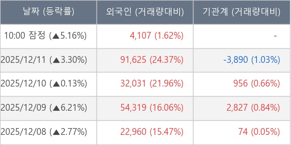 [서울=뉴스핌] 로보뉴스 = 12일 10시 15분 현재 파이버프로(368770)는 전일 대비 5.16% (현재가 8,560원) 상승했고, 외국인이 최근 6일 연속 순매수(누적 21.41만 주, 잠정) 행진을 하고 있다.