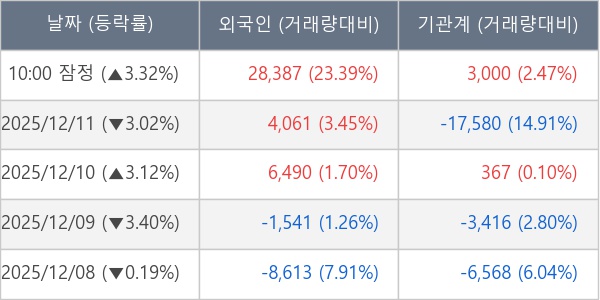 [서울=뉴스핌] 로보뉴스 = 12일 10시 15분 현재 한중엔시에스(107640)는 외국인과 기관이 각각 2.84 만 주, 0.30 만 주 순매수(잠정) 하면서 전일 대비 3.32% (현재가 51,400원) 상승하고 있다.