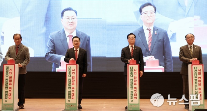 [대전=뉴스핌] 오종원 기자 = 이장우(왼쪽부터 두 번째) 대전시장이 12일 시청 대강당에서 열린 '대전-충남 행정통합 설명회 및 시민 한마음 촉구대회'에서 관계자들과 함께 대전충남 특별법 국회 통과를 촉구하는 퍼포먼스를 진행하고 있다. jongwon3454@newspim.com