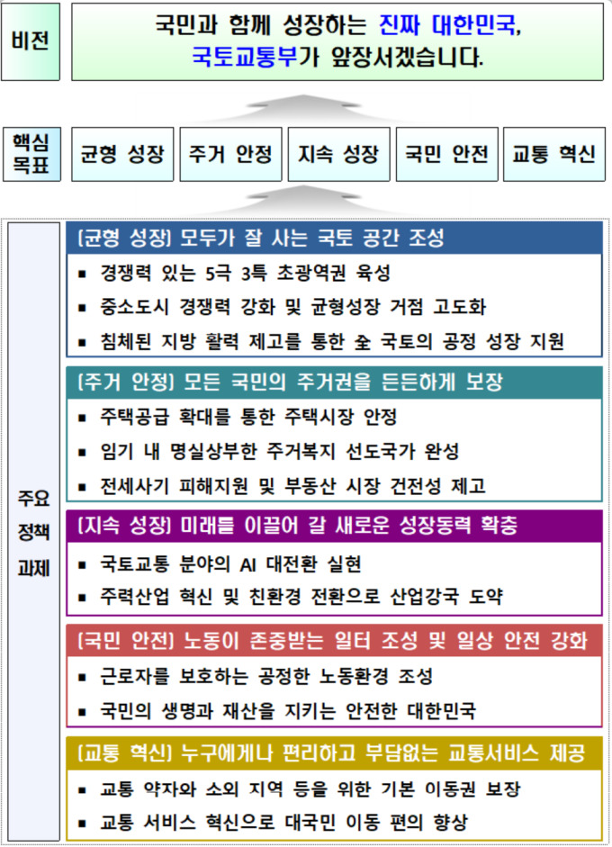 국토부가 설정한 5대 분야는 ▲지방 활성화(균형성장·지역경제) ▲경제 성장(미래산업·건설활력) ▲부동산 안정(주택공급·주거복지) ▲공정사회(안전혁신·약자보호) ▲국민 편익(서비스 개선·구조개혁)이다.