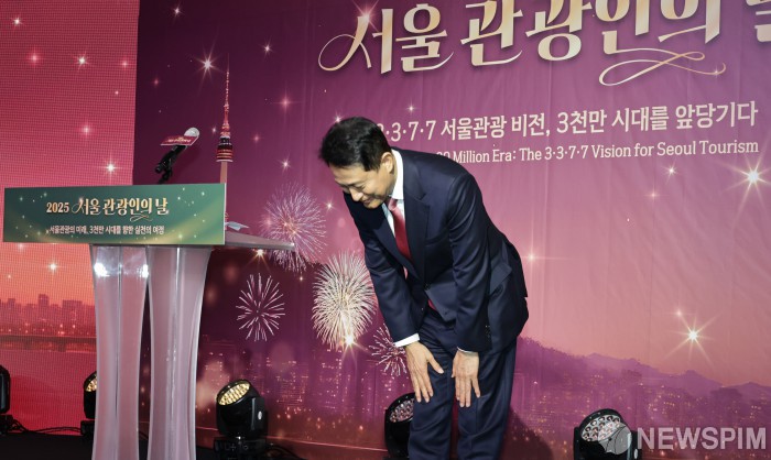 [서울=뉴스핌] 양윤모 기자 = 오세훈 서울시장이 12일 오후 서초구 세빛섬 플로팅 아일랜드에서 개최된 '2025 서울관광인의 날 및 서울관광대상 시상식' 행사에 참석해 인사말을 하기전 고개숙여 인사하고 있다. 2025.12.12 yym58@newspim.com