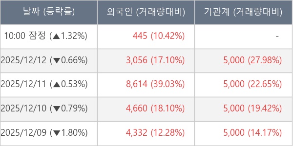 [서울=뉴스핌] 로보뉴스 = 15일 10시 15분 현재 비아트론(141000)은 전일 대비 1.32% (현재가 7,670원) 상승했고, 외국인이 최근 5일 연속 순매수(누적 21,107주, 잠정) 행진을 하고 있다.