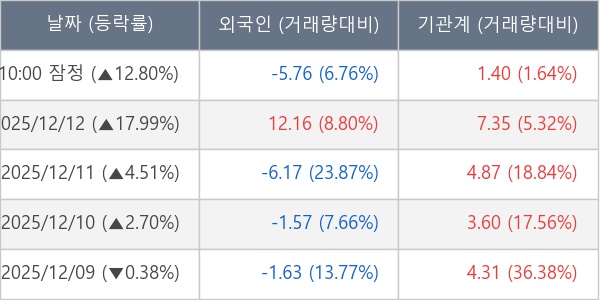 [장중수급포착] 에이치브이엠, 기관 7일 연속 순매수행진... 주가 +12.80%