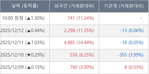 [서울=뉴스핌] 로보뉴스 = 15일 10시 15분 현재 유니드비티플러스(446070)는 전일 대비 1.30% (현재가 3,495원) 상승했고, 외국인이 최근 5일 연속 순매수(누적 9,240주, 잠정) 행진을 하고 있다.
