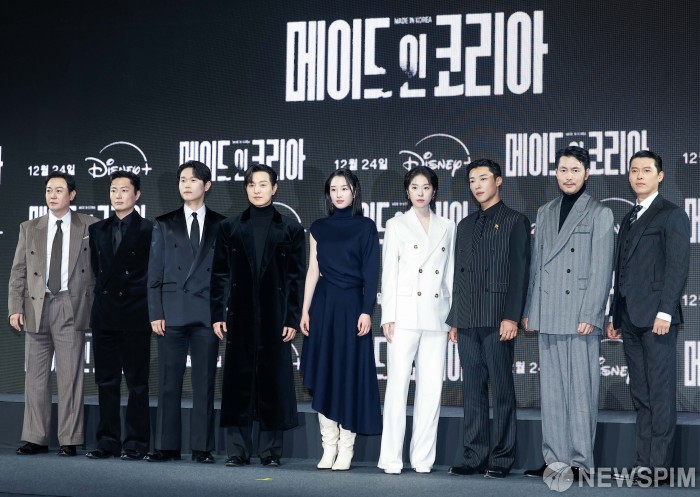 [서울=뉴스핌] 류기찬 기자 = 배우 현빈, 정우성 등 출연진들이 15일 오전 서울 강남구 그랜드인터컨티넨탈 서울파르나스에서 열린 디즈니+ 오리지널 시리즈 ‘메이드 인 코리아’ 제작발표회에서 포즈를 취하고 있다. 메이드 인 코리아는 1970년대 혼란과 도약이 공존했던 대한민국, 국가를 수익모델로 삼아 부와 권력의 정점에 오르려는 사내 백기태(현빈)와 그를 끝까지 추적하는 검사 장건영(정우성)이 시대를 관통하는 거대한 사건들과 직면하는 이야기를 그린 작품이다. 2025.12.15 ryuchan0925@newspim.com