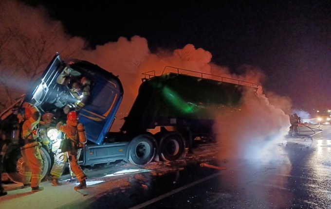 [칠곡=뉴스핌] 남효선 기자 = 경북 칠곡의 한 도로에서 주행 중이던 탱크로리 차량과 윙바디 화물차가 추돌해 화재가 났다. 탱크로리 운전자 A(50대) 씨가 숨지는 등 2명의 사상자가 발생했다.
