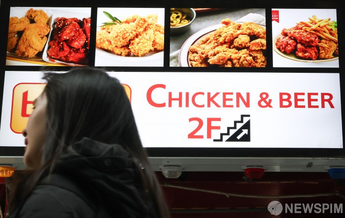 [서울=뉴스핌] 최지환 기자 = 정부가 상위 10대 치킨 프랜차이즈를 대상으로 매장 및 배달 주문 메뉴판에 조리 전 닭고기 무게를 고지해야 되는 '치킨 중량표시제'를 실시한 15일 서울 시내의 한 치킨매장 앞으로 시민들이 오가고 있다. 2025.12.15 choipix16@newspim.com
