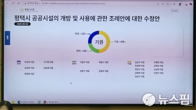 [평택=뉴스핌] 이성훈 기자 =조례안 투표 모니터 모습. 2025.12.15 krg0404@newspim.com