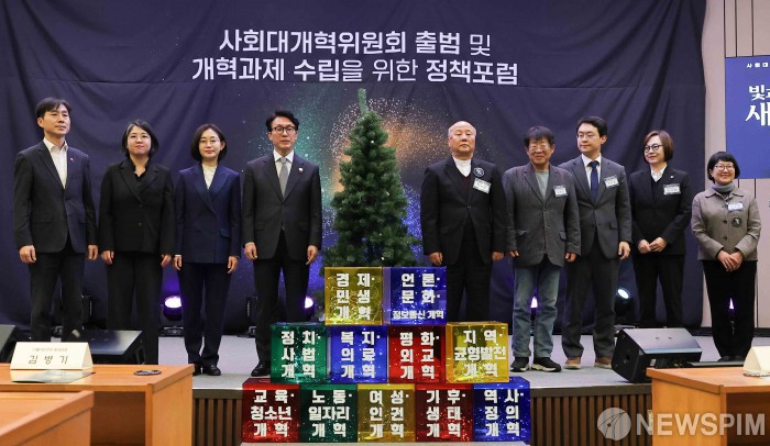 [서울=뉴스핌] 윤창빈 기자 = 김민석 국무총리를 비롯한 정당, 시민사회 단체 참석자들이 15일 서울 여의도 국회 박물관에서 열린 사회대개혁위원회 출범 및 개혁과제 수립을 위한 정책포럼에서 기념 퍼포먼스를 하고 있다. 2025.12.15 pangbin@newspim.com